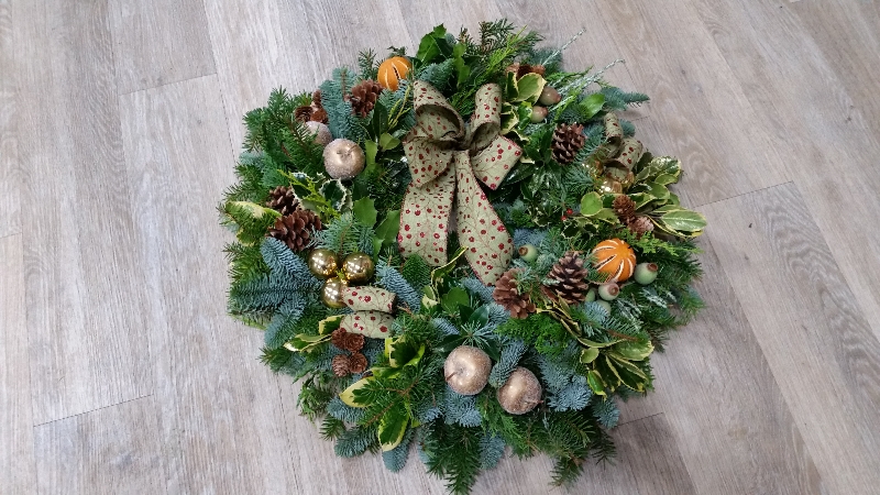 A sprinkling of miniature baubles adds just the right amount of festive sparkle, reflecting the soft light of your home with a welcoming glint. Completing the wreath is a tasteful festive ribbon, its elegance understated yet cheerful, bearing the joyous message of Christmas to all who come to visit.