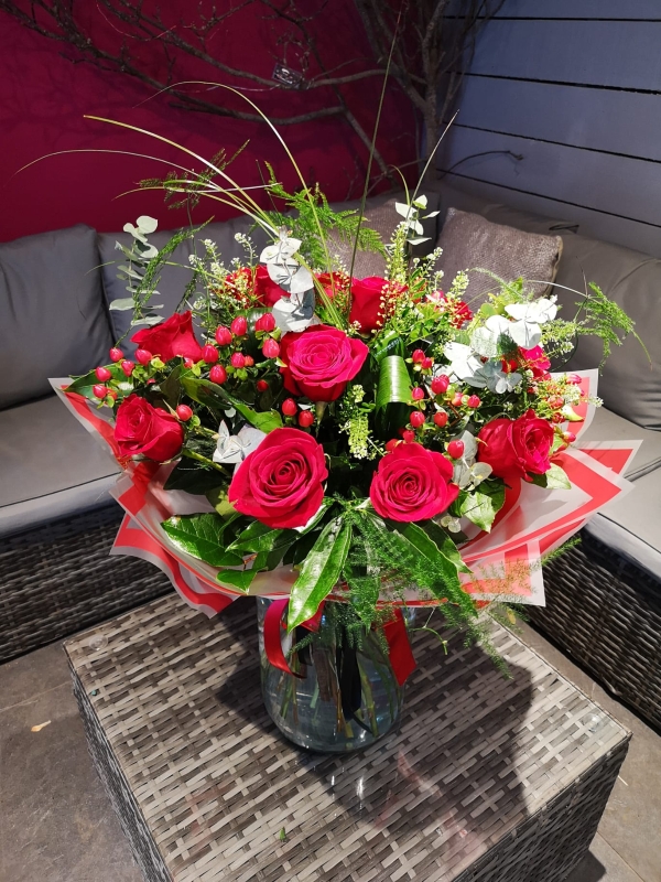 Discover Kimberleys the Florist Extra Special Dozen Red Rose bouquet this Valentines. This beautiful hand-tied bouquet in a vase features 12 premium large headed long stem roses, with an array of luxurious foliage to really impress.