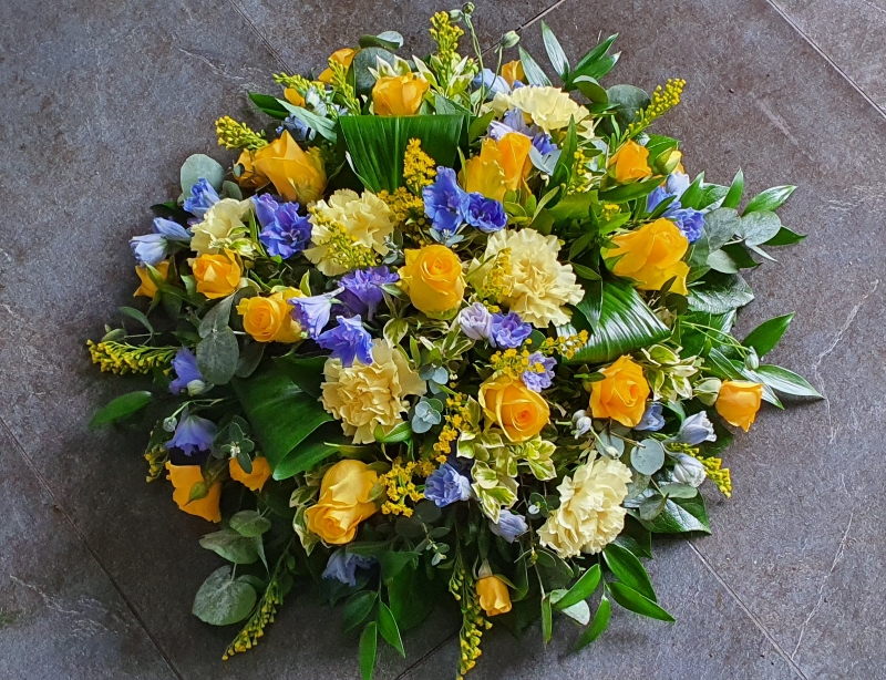 A cheerful and elegant tribute featuring vibrant yellow roses, delicate blue delphiniums, and soft lemon carnations. Accented with seasonal blooms and lush greenery, this round arrangement is perfect for expressing sympathy. Choose a size from 12 to 16 inches, or give us a call if you'd like something custom made.