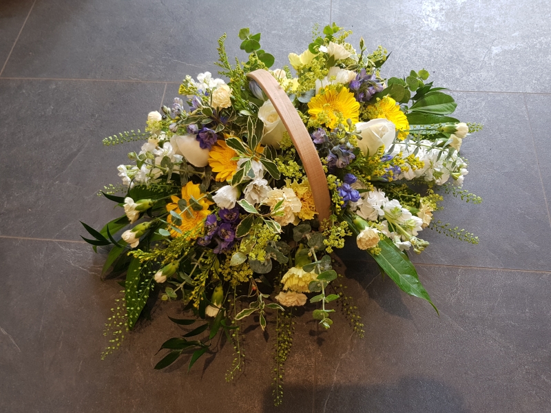 A beautiful country-style trug filled with blue delphinium, scented white stocks, golden yellow germini, ivory roses, and solidago. Accented with lush green and silver-grey foliage