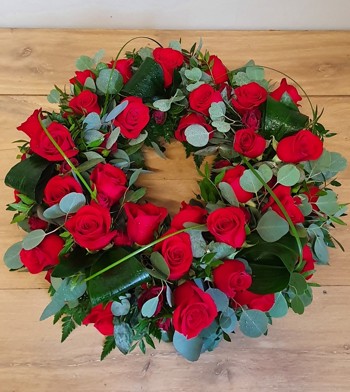 • Funeral wreath with rich red roses and mixed foliage