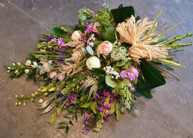 A spectacular country mix sheaf with textured veronica, scented stocks and phlox, beautiful roses, long white delphinium, pale pink astilbe and country foliage.