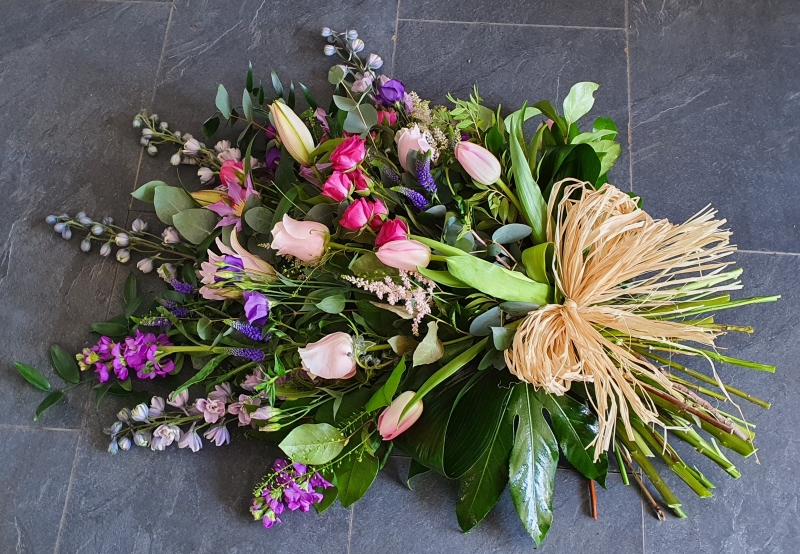 • Hand-tied funeral sheaf with delphiniums, scented stocks and hyacinths, hellebore and other countryside flowers.