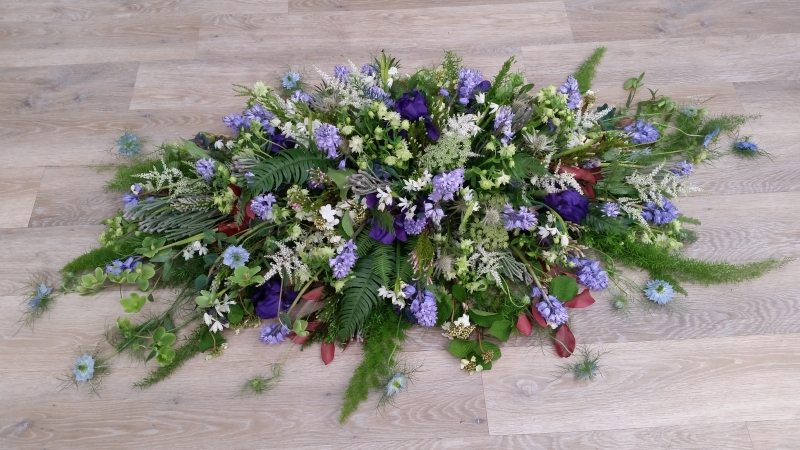 A beautiful coffin tribute inspired by the calm of the woodland. A soft, textural design created with the best blooms of the season, arranged to feel calming, elegant, and heartfelt. Featuring a seasonal woodland style mix that may include snowdrops, bluebells, astilbe, lisianthus, astrantia, hellebores, and nigella, each piece is finished with mixed foliage and a hand-picked woodland selection based on what’s freshest and most beautiful at the time.