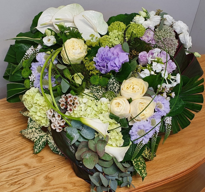 A stunning textured heart with beautiful ivory roses, a blend of pastel lilacs, tropical white anthuriums and designer white cala lilies complete with textured foliage in greens and silver greys.