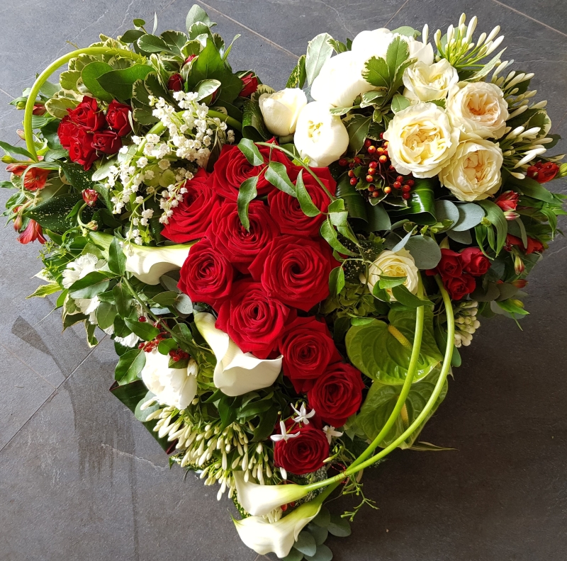 A stunning textured heart with a modern twist designed with beautiful red and ivory roses, white agapanthus, red spray roses, lime green anthuriums and structured white cala lilies.