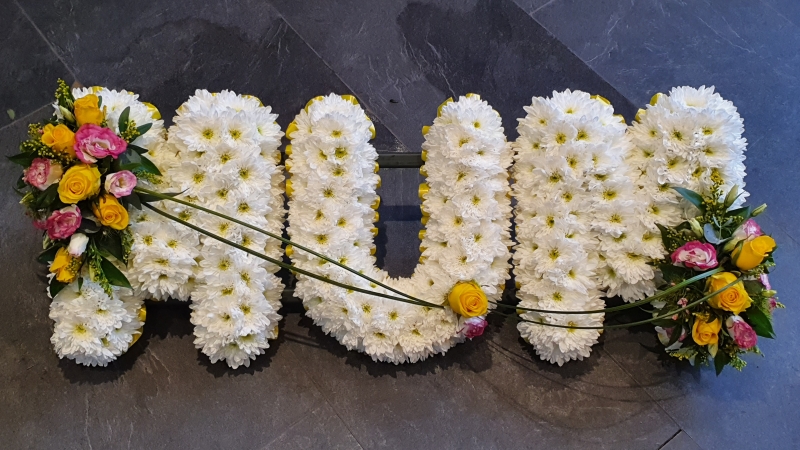 Similar to our Classic Mum letters, but with your unique choice of flowers on the sprays. Perhaps your Mum had a favourite flower that we could include, or something to match her Wedding Bouquet.